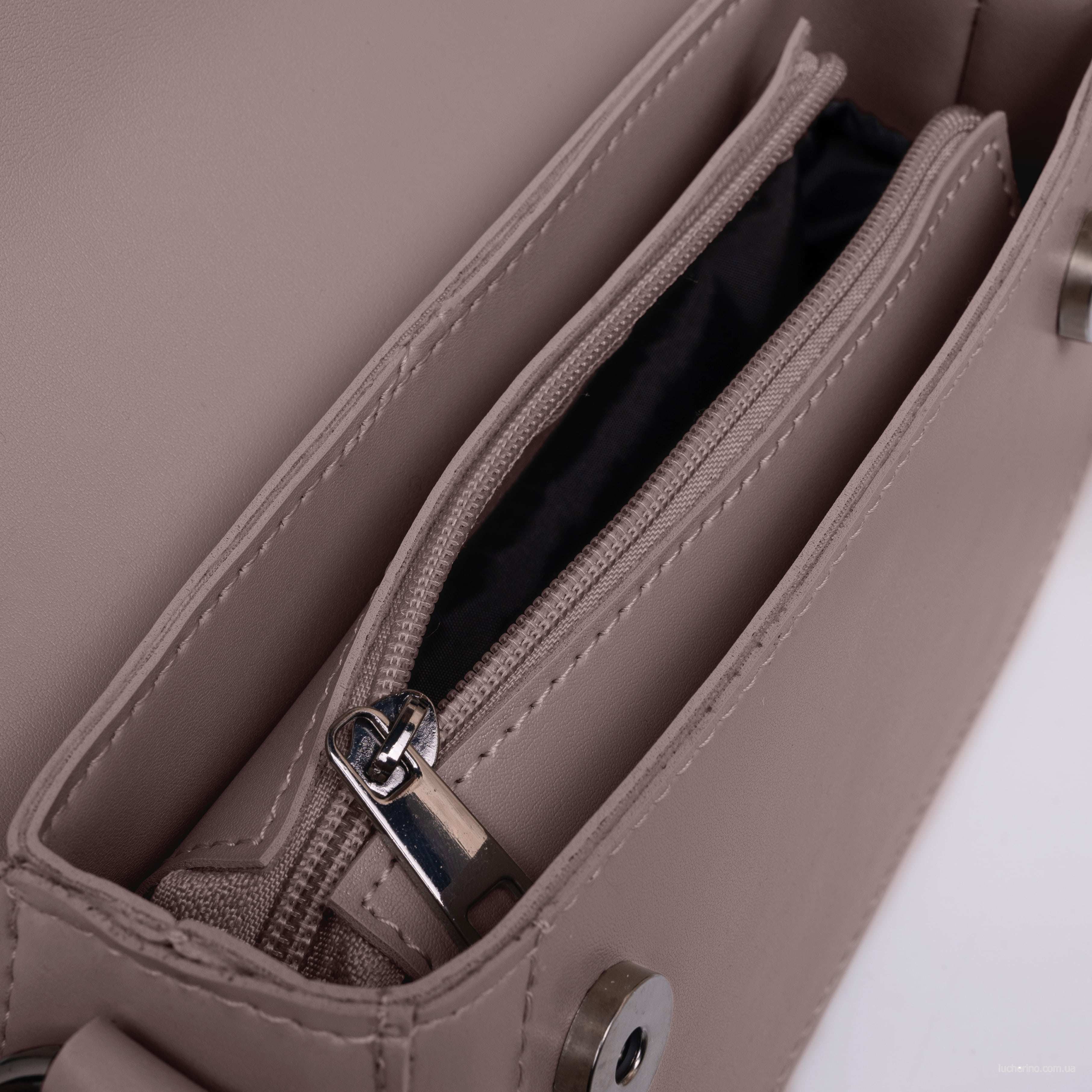 Сумка на одне загальне відділення. Не дивлячись на невеликі розміри, сумочка виявилась достатньо вмісткою. Весь виріб зачиняється на блискавку. Довгий ремінь з можливість регулювання довжини виготовлений з шкірзаміннику. На задній стінці вмонтована кишеня, яка зачиняється на блискавку.