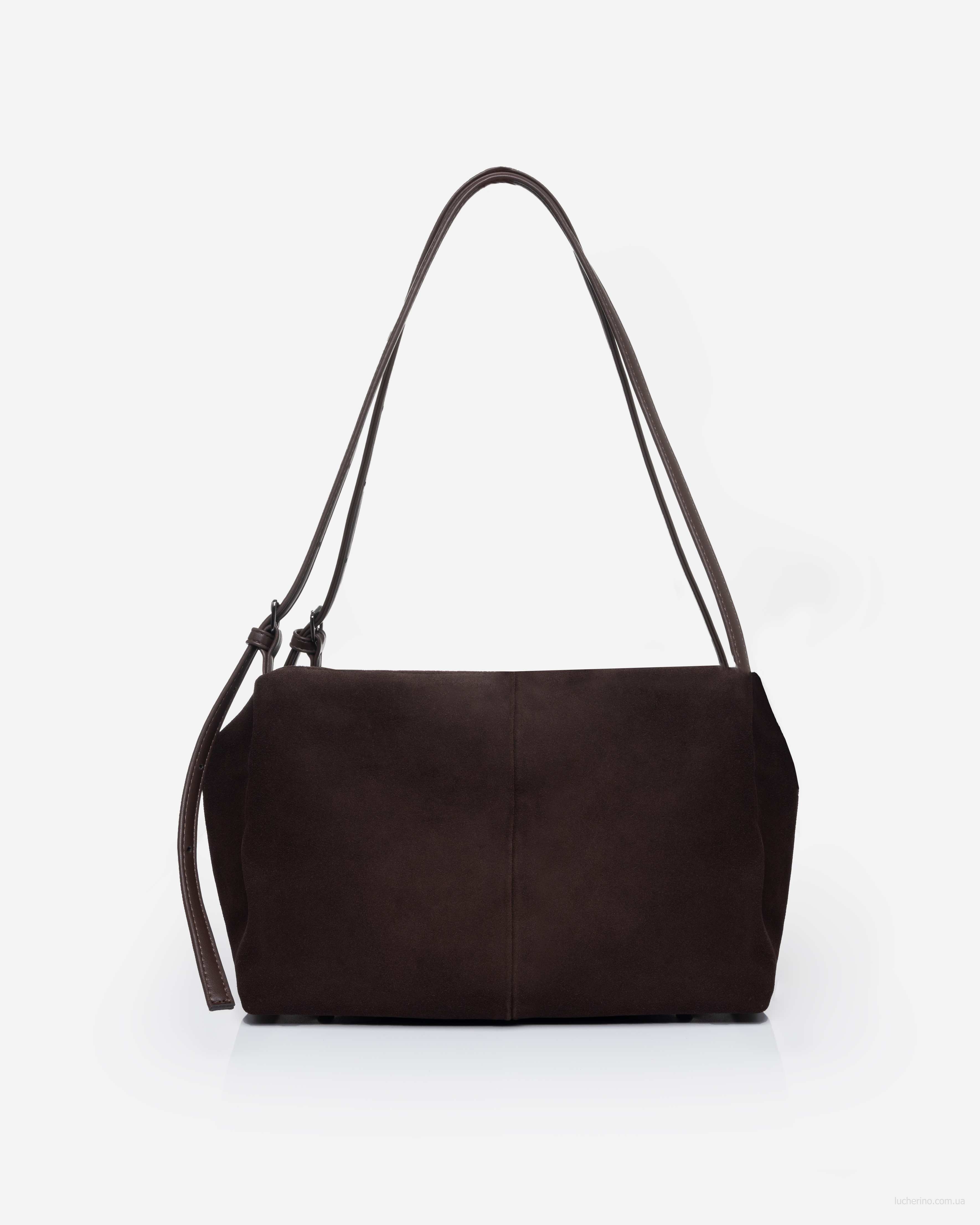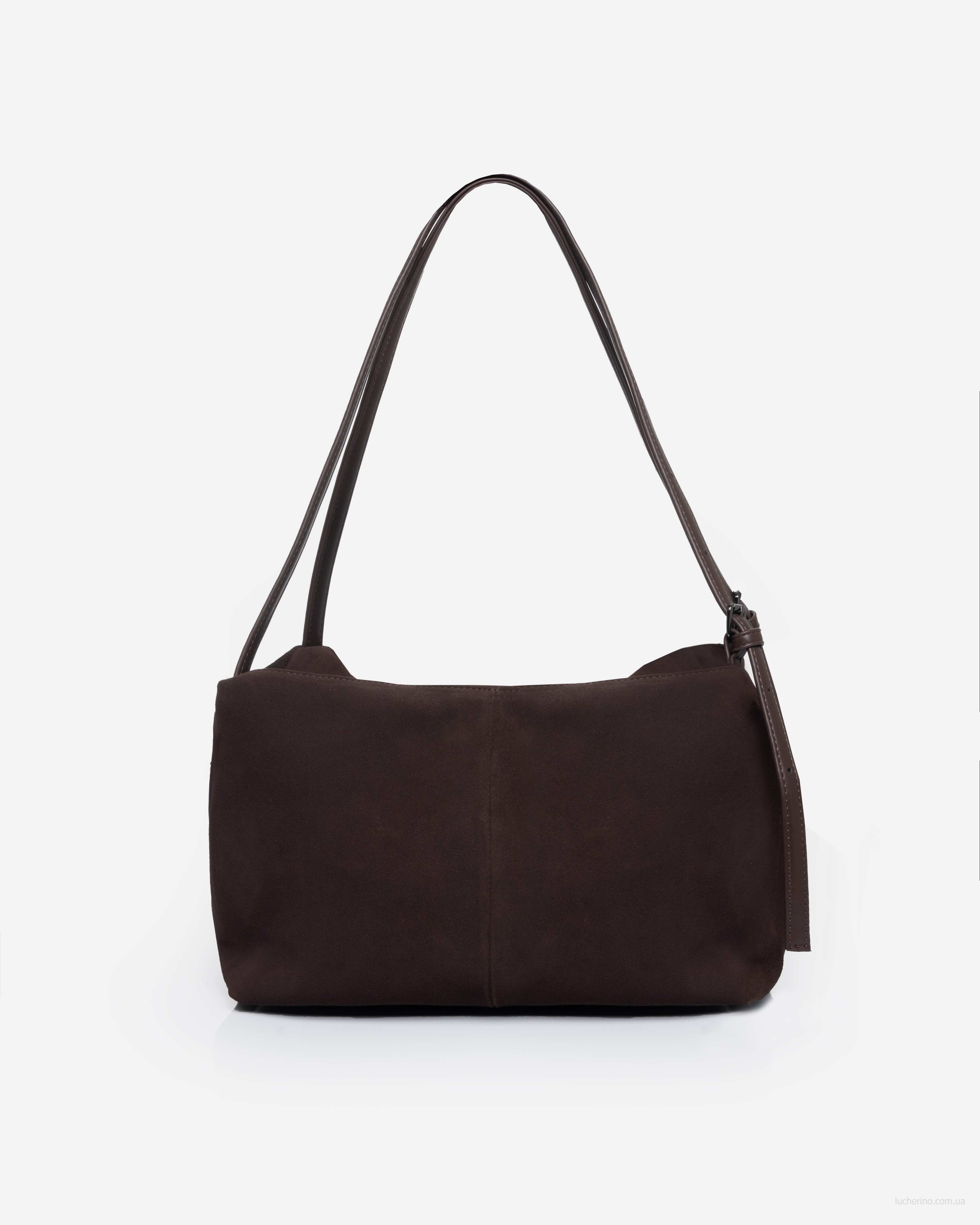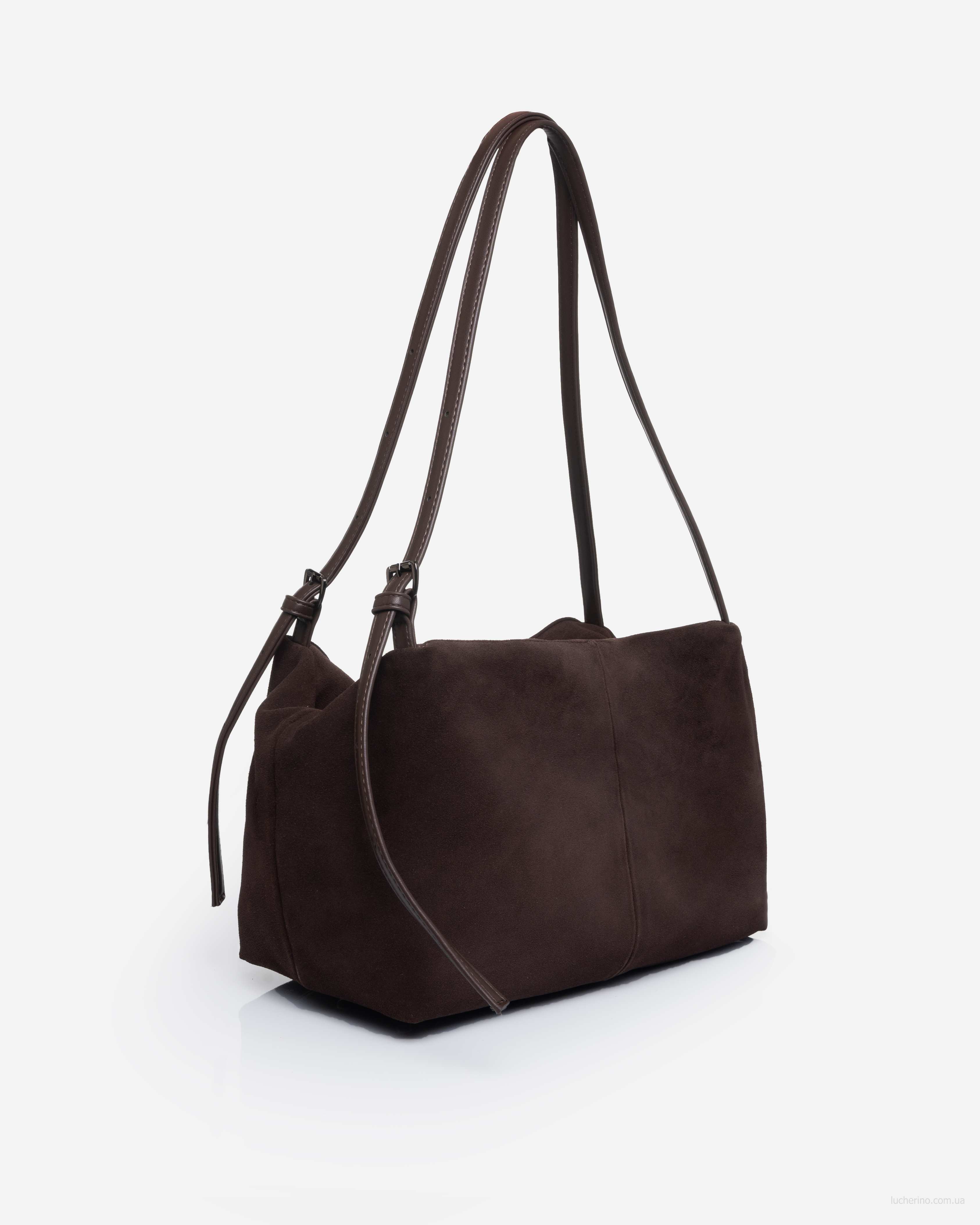 Сумка з двома ручками середньої довжини, які ручно носити в руці та на плечі. Передня та задня зовнішні стінки оздоблені великими накладними функціональними замшевими кишенями, які зручно зачиняються магнітними застібками.